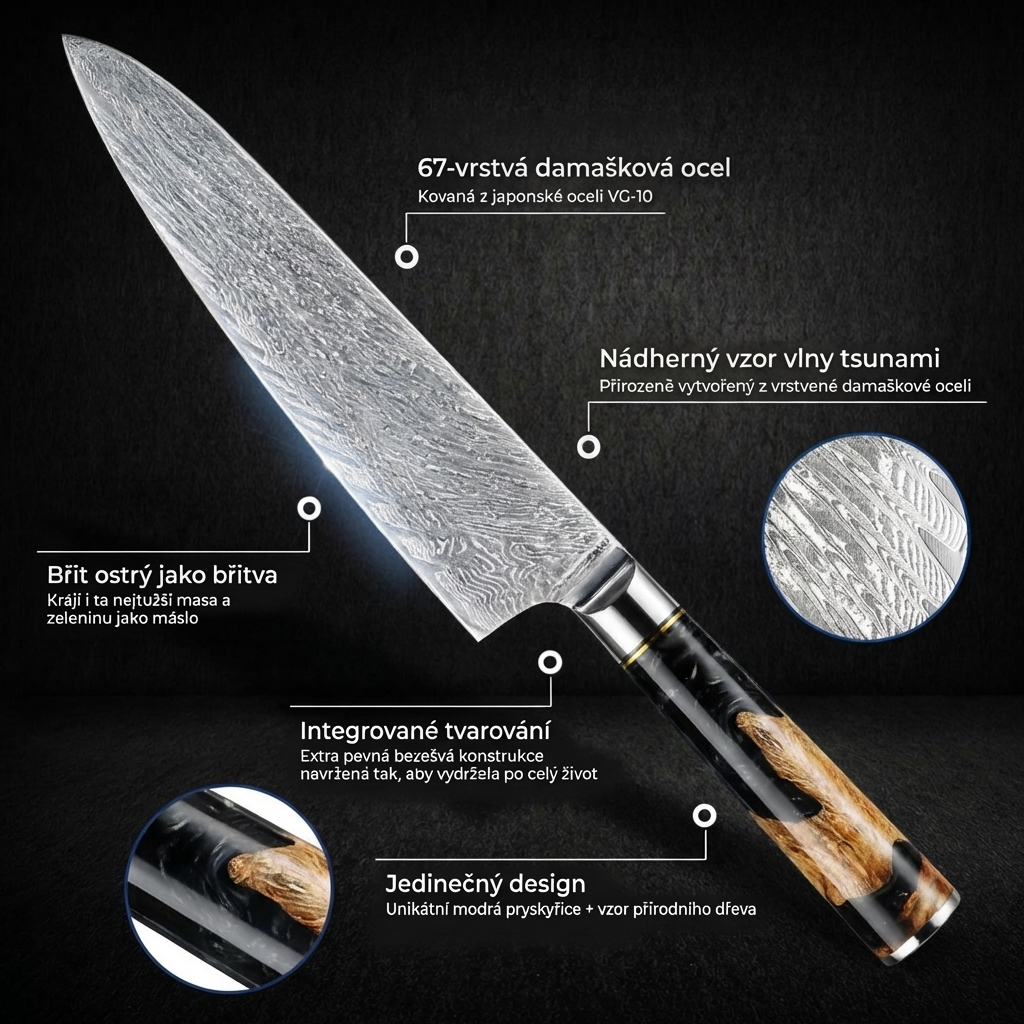- Značková damaškové ocel – Ocel profesionální kvality nabízející bezkonkurenční přesnost, odolnost a dlouhodobou ostrost; rozdíl pocítíte již při prvním řezu.