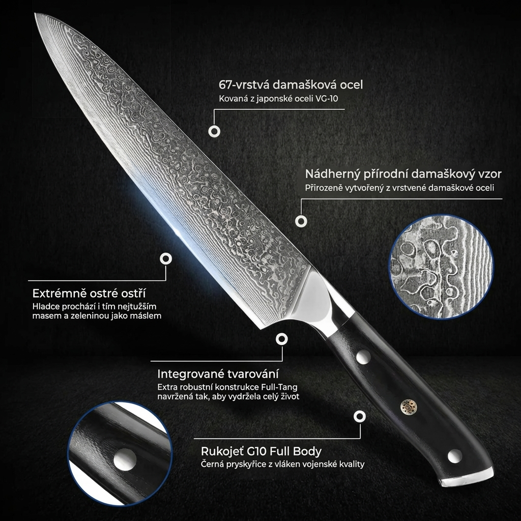 - Značková damaškové ocel – Ocel profesionální kvality nabízející bezkonkurenční přesnost, odolnost a dlouhodobou ostrost; rozdíl pocítíte již při prvním řezu.