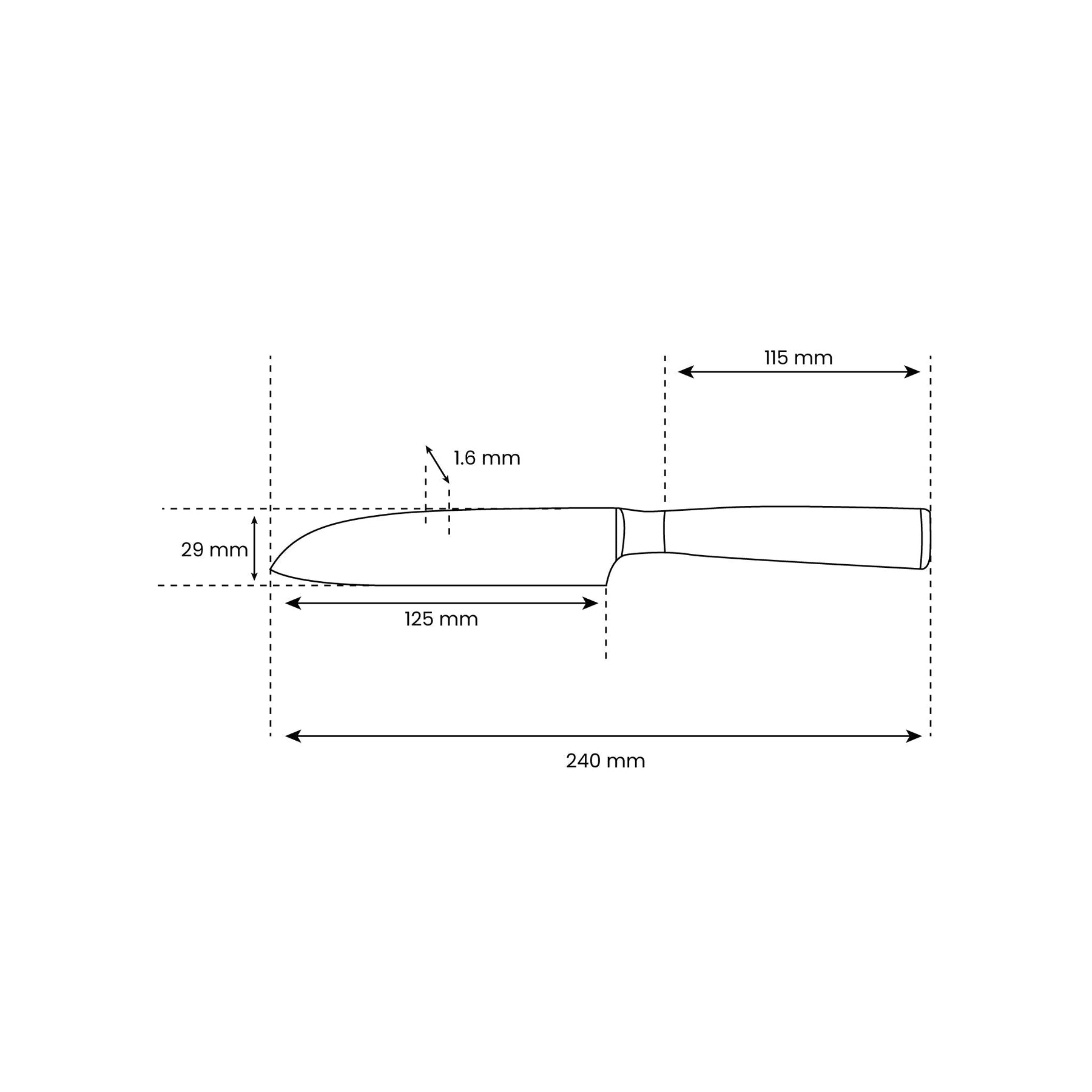 Celková délka nože 24 cm zajišťuje kompaktní velikost, která je bezpečná a pohodlná v ruce. Ergonomická rukojeť o délce 11,5 cm poskytuje jistý a pohodlný úchop, což umožňuje přesné a snadné pohyby s minimálním úsilím.